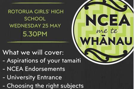 NCEA ME TE WHĀNAU WORKSHOP Join us for a workshop designed to help Whānau understand the in's and out's of NCEA. ROTORUA GIRLS HIGH SCHOOL...
