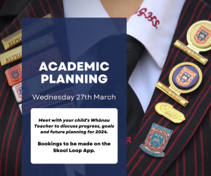 📚 Join us on Wednesday, March 27th for our first Academic Planning for 2024! 🎓 Meet with your child's Whānau Teacher to discuss progress, goals, and future planning for the year ahead.