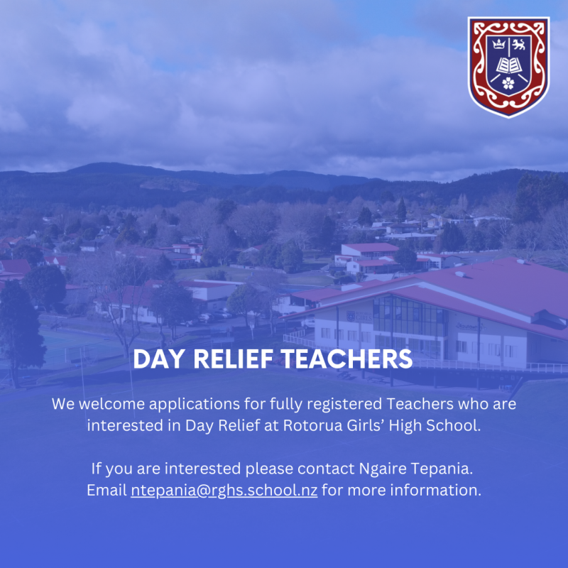 Share this page: Facebook LinkedIn Pinterest X Day Relief Teachers WantedWe welcome applications for fully registered Teachers who are interested in Day Relief at Rotorua Girls’ High School.If you are interested please contact Ngaire Tepania. Email [email protected] for more information.